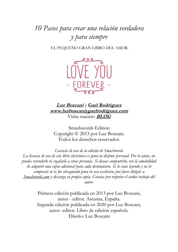 * NOVEDAD * ¡Ahora disponible en formato audiolibro! Búscalo en la tienda de Audiolibros de Google Play ***Una preciosa obra para atesorar y compartir*** -Edición especial, incluye DE REGALO la obra Corazón de miel, Poemas de amor de Gael Rodríguez- Luz Boscani, autora de la exitosa serie titulada «10 Pasos» nos invita a recorrer el apasionante camino de la inspiración, la profundidad, la verdad, el amor y la belleza. 10 pasos para crear una relación verdadera y para siempre nos cuenta las cualidades y virtudes que debemos desarrollar para construir una relación de pareja sana y perdurable. Temas como la fidelidad, la confianza, la admiración y la entrega forman parte de esta bella obra. Aprenderemos a relacionarnos desde un espacio de verdad, desde nuestro corazón. Si lo que deseamos es vivir en estado de amor puro y verdadero, las reflexiones de esta obra nos entusiasmarán. Entrégate y experimenta la magia del regalo más maravilloso que nos ha sido otorgado, el amor. www.luzboscaniygaelrodriguez.com Descubre cada día pensamientos poderosos para una vida maravillosa. Síguenos en TikTok @luzboscaniygaelrodriguez y en YouTube: Luz Boscani y Gael Rodríguez