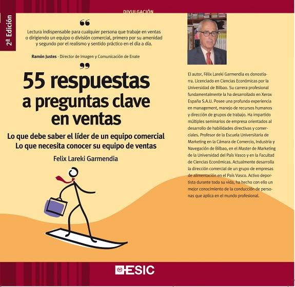 El libro “55 respuestas a preguntas clave en ventas” da soluciones a preguntas en el día a día de la negociación comercial. Escrito por un profesional de la venta y profesor universitario, Félix Lareki afirma que es un libro para ser leído por todas las personas que o bien practican la venta como su profesión diaria, bien desarrollan puestos de responsabilidad como Directores comerciales o jefes de ventas o son estudiantes de escuelas de marketing o de negocios en general. El autor da respuestas a 55 preguntas claves en el mundo de las ventas y de la negociación comercial. ¿Cómo interpretar mejor las razones de compra y acercarnos a los deseos del comprador? ¿Cómo generar valor en nuestra relación con clientes? ¿Cómo entender mejor sus necesidades? ¿La oferta de valor es posible ante clientes imposibles? ¿Está todo inventado en ventas? ¿Siempre es posible un acuerdo? ¿Las objeciones, siempre son un elemento negativo en la relación? ¿Qué hacer ante el cliente precio? ¿Existe realmente el superman de las ventas? ¿Las ventas y la moralidad, pueden ir de la mano? ¿Cuál es el secreto para elegir al mejor vendedor? El autor quiere transmitir sus múltiples experiencias desarrolladas a través de miles de entrevistas de ventas con clientes y no clientes, facilitando una herramienta valiosa a las personas que hacen de la venta y de la relación una maravillosa profesión. El autor afirma que la responsabilidad más importante de cualquier vendedor es mostrar a su posible cliente los beneficios –no siempre económicos- que reporta una determinada decisión de compra, aportando “valores” que justifiquen la misma. El autor, Félix Lareki es donostiarra, licenciado en Ciencias Económicas por la Universidad de Bilbao. Su carrera profesional fundamentalmente la ha desarrollado en Xerox España. Posee una profunda experiencia en management, manejo de recursos humanos y dirección de grupos de trabajo. Profesor de la Escuela Universitaria de Marketing en la Cámara de Comercio, Industria y Navegación de Bilbao y en la Universidad del País Vasco. Índice: Entender las razones de compra es acercarnos a los deseos del comprador.- Las necesidades del cliente y la generación de valor.- La aportación de “valor” como hecho diferencial en la relación. Estrategias para generarlo.- Dejar de ofertar para negociar.- La venta negociada como equilibrio de fuerzas.- La venta negociada es un arte, pero exige técnicas que hay que entrenar con una preparación continua.- Los clientes son muy distintos entre sí. Muchos de ellos plantean frenos a la venta negociada en forma de objeciones.- Rematar la faena, ¿tarea ardua y difícil?.- La mochila del guerrero. El vendedor superestrella ¿hay un modelo a seguir? – La ética y el beneficio. El criterio para seleccionar al mejor vendedor.- Los líderes ¿realmente existen?