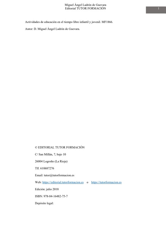 Este Manual es el más adecuado para impartir el MF1866 «Actividades de educación en el tiempo libre infantil y juvenill» de los Certificados de Profesionalidad, y cumple fielmente con los contenidos del Real Decreto. Puede solicitar gratuitamente las soluciones a todas las actividades y al examen final en el email tutor@tutorformacion.es Capacidades que se adquieren con este Manual: – Analizar el concepto de tiempo libre educativo y su evolución dentro del marco general de la educación y sociedad. – Identificar los conceptos educativos y los agentes intervinientes en la socialización que generan educación integral para la infancia y juventud. – Diferenciar los marcos de referencia atribuibles a la intervención en el tiempo libre infantil y juvenil. – Elaborar actividades de tiempo libre educativo infantil y juvenil. – Determinar la secuencia de acciones que se precisan para desarrollar un proyecto conforme a la educación en el tiempo libre. – Aplicar técnicas de evaluación de actividades educativas a contextos de tiempo libre. – Estimar la función del/a monitor/a como modelo transmisor de hábitos de salud. Índice: Aplicación de los fundamentos de la educación en el tiempo libre infantil y juvenil 5 1. Usos y funciones del tiempo libre en la sociedad actual. 6 1.1. Cuantificación, distribución y funciones del ocio y tiempo libre en la infancia y juventud. 6 2. Aplicación para la educación integral y el proceso de socialización. 12 3. Tiempo libre social y educativo: contextos, actividades, y modos de intervención. 18 3.1. Ámbitos de actuación. 18 3.2. Tipos de actividades. 20 3.3. Modos de intervención. 20 4. Aplicación del marco legislativo correspondiente a las actividades de tiempo libre infantil y juventud. 29 5. Test de investigación. 38 Aplicación de procesos educativos y socializadores en la infancia y la juventud. 40 1. Identificación y caracterización de los distintos contextos educativos (educación formal, no-formal, informal, integral. 41 2. Identificación y caracterización de los distintos agentes educativos y socializadores. 45 2.1. La familia. 46 2.2. La escuela. 46 2.3. El grupo de iguales. 48 3. Aplicación del proceso de socialización en la infancia, adolescencia y juventud. 51 3.1. Elementos y factores de apoyo y de riesgo. Análisis de causas y consecuencias, individuales y grupales, de la exclusión e inadaptación social. 53 4. Modos de intervención educativa en el proceso de socialización. 75 5. Impartición de una educación en valores y rol de la persona educadora. 85 5.1. Identificación y tipología de los valores. 85 5.2. Aplicación en las actividades de tiempo libre. Actuación de los monitores. 92 6. Métodos de participación en el tiempo libre educativo. 97 6.1. La «Escalera de la participación». 97 6.2. Consecuencias de la participación. 100 6.3. Técnicas en las que participa todo el grupo activamente. 101 7. Test de investigación. 105 Elaboración en el tiempo libre infantil y juvenil de proyectos, y propuesta y evaluación de las actividades de intervención. 107 1. ¿Qué es Planificar? 108 2. La redacción de un proyecto. 111 3. El análisis de la realidad. 114 3.1. Análisis de la realidad: fase de diagnóstico del entorno. 114 3.2. Posibles ítems a valorar en el diagnóstico. 115 3.3. Instrumentos de análisis. 115 4. Los objetivos. 119 5. La metodología y las actividades. 124 6. La temporalización. 132 7. Recursos económicos y materiales. 140 7.1. Los recursos económicos: Presupuestos. 140 7.2. Elementos de un presupuesto. 141 7.3. Los recursos materiales. Los Equipamientos. 142 7.4. Características de los espacios y equipamientos socioculturales. 143 7.5. Clasificación de equipamientos socioculturales. 143 7.6. La coordinación de los recursos socioculturales. 144 8. La evaluación. 147 8.1. Elementos de la evaluación. 149 9. Ejemplo de Proyecto de «Escuela de fútbol de verano». 153 10. Análisis del perfil, funciones y ámbitos de actuación del monitor/a de tiempo libre. 164 10.1. Conocimientos básicos que debe tener un monitor. 164 10.2. Factores y ámbito de actuación de un monitor. 164 10.3. Tipología de actividades. 165 10.4. Funciones. 166 10.5. Perfil. 167 11. Métodos básicos de trabajo en equipo: equipo de monitores. 169 11.1. La organización del equipo de trabajo. 169 12. Test de investigación. 176 Estrategias y métodos de educación para la salud 181 1. Conceptos básicos de educación para la salud. Aplicación de hábitos de vida saludables (HVS). 182 1.1. Hábitos de vida saludables en niños y jóvenes (HVS). 183 2. Análisis de responsabilidades del monitor en la educación para la salud. 192 3. Planificación de recursos y métodos de prevención de conductas de riesgo y para la promoción y fomento de los hábitos de vida saludables (HVS). 194 3.1. Creación de hábitos (de 6 a 9 años). 194 3.2. Consolidación de hábitos (de 10 a 13 años). 196 3.3. Mantenimiento de hábitos (de 14 a 18 años). 199 4. Test de investigación. 205