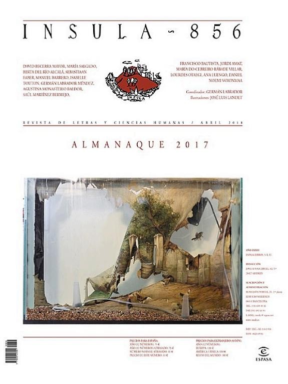Almanaque 2017 (Ínsula n° 856, abril de 2018) Almanaque 2017 David BECERRA / Narrativa española. Un enfoque desde la bibliodiversidad (para seguir viviendo) María SALGADO / Algunas grietas del año 2017 en la poesía escrita en (algo así como) España Berta DEL RÍO ALCALÁ / Mapas teatrales de 2017: cuerpos precarios ocultados por la Historia, visibles en escena Sebastiaan FABER / La consolidación de un ensayismo 2.0 (prosa de ideas y prensa de opinión en 2017) Isabelle TOUTON / Acción, memoria y sentimiento en el cómic en 2017 Germán LABRADOR MÉNDEZ / 2017, que nadie se siente: un panorama de los estudios peninsulares para los siglos XX y XXI Agustina MONASTERIO BALDOR / Las conexiones restablecidas. Un panorama historiográfico de los siglos XVIII y XIX en 2017 Saúl MARTÍNEZ BERMEJO / Un panorama de los estudios sobre el Siglo de Oro a lo largo de 2017 Francisco BAUTISTA / Los estudios medievales hispánicos en 2017 Jordi AMAT / «Any estrany». Letras catalanas en 2017 María do Cebreiro RÁBADE VILLAR / H aced el favor de no romantizar: letras gallegas en 2017 Lourdes OTAEGI / Paisajes de la literatura vasca en 2017 Ana LUENGO / 2017: Escrituras latinoamericanas (el resto es literatura)