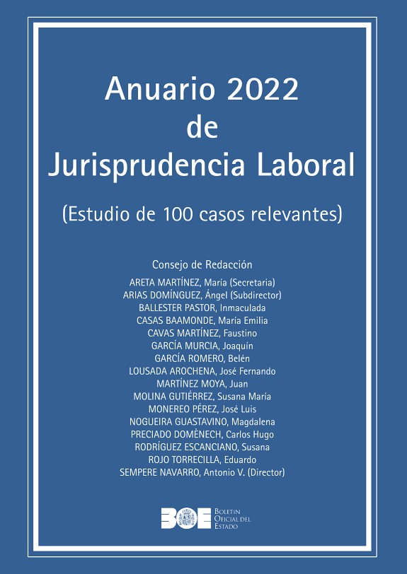 La Revista de Jurisprudencial Laboral (RJL) es una publicación digital, periódica, independiente, alojada en la web del BOE, accesible en abierto y dedicada al estudio de la doctrina judicial y de la jurisprudencia reciente en el ámbito de las relaciones sociolaborales. Este Anuario reúne y sistematiza los comentarios aparecidos en todos los números de la RJL correspondientes al año natural indicado en su título. Aparece ahora publicado como libro autónomo de la Colección de Derecho del Trabajo y de la Seguridad Social, en versiones digital y soporte papel. El número del Anuario-2022 contiene cien estudios de resoluciones judiciales coetáneas, procedentes de diversos órganos: Tribunal Europeo de Derechos Humanos, Tribunal de Justicia de la Unión Europea, Tribunal Constitucional , Sala de lo Civil del Tribunal Supremo, Sala de lo Penal del Tribunal Supremo , Sala de lo Contencioso del Tribunal Supremo, Sala de lo Social del Tribunal Supremo, Sala de lo Social de la Audiencia Nacional, Salas de lo Social de los Tribunales Superiores de Justicia, Juzgados de lo Contencioso y Juzgados de lo Social. La obra obedece a una estructura interna común en cada uno de sus apartados, lo que facilita su consulta; viene acompañada, además, de índices analíticos, sistemáticos y onomásticos. La AEBOE no se solidariza con las opiniones sostenidas por los autores de los originales publicados. © AEBOE por la presente edición © Los autores por sus respectivas monografías NIPO AEBOE (papel): 090-20-130-9 NIPO AEBOE (PDF): 090-20-131-4 ISBN: 978-84-340-2905-7 Depósito Legal: M-4742-2023