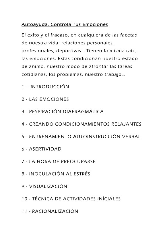 El éxito y el fracaso, en cualquiera de las facetas de nuestra vida: relaciones personales, profesionales, deportivas… Tienen la misma raíz, las emociones. Estas condicionan nuestro estado de ánimo, nuestro modo de afrontar las tareas cotidianas, los problemas, nuestro trabajo… 1 – INTRODUCCIÓN 2 – LAS EMOCIONES 3 – RESPIRACIÓN DIAFRAGMÁTICA 4 – CREANDO CONDICIONAMIENTOS RELAJANTES 5 – ENTRENAMIENTO AUTOINSTRUCCIÓN VERBAL 6 – ASERTIVIDAD 7 – LA HORA DE PREOCUPARSE 8 – INOCULACIÓN AL ESTRÉS 9 – VISUALIZACIÓN 10 – TÉCNICA DE ACTIVIDADES INÍCIALES 11 – RACIONALIZACIÓN En este libro aprenderás, de forma práctica, como despertar tu poder interior, para modificar tu vida, y alcanzar las metas que deseas. GRATIS: Para ayudarte en la comprensión y puesta en práctica de este manual, te ofrecemos una Tutoría personal, vía email, sin ataduras ni compromisos, ni incluirte en una lista comercial, entra en https://cursosterapiasnaturales.org/libros accede a la página de tu libro y encontrarás las instrucciones.