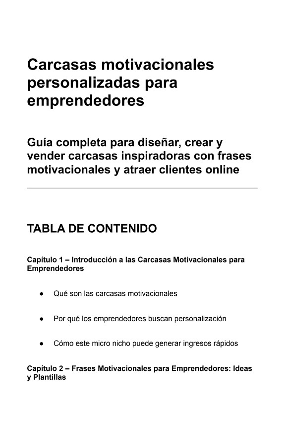 Este libro explora cómo las carcasas motivacionales personalizadas pueden convertirse en una poderosa herramienta para los emprendedores que buscan inspiración y enfoque en su día a día. A través de frases motivadoras, diseños creativos y mensajes personalizados, descubrirás cómo un objeto tan cotidiano como una carcasa puede recordarte tus metas, mantener tu energía positiva y reforzar tu mentalidad emprendedora. Una guía práctica para transformar pequeños detalles en grandes aliados en tu camino hacia el éxito. Resumen corto: