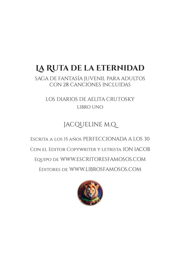 Autor: Jacqueline M.Q. Editorial: Ion Iacob Año: — Resumen #1 en LibrosFamosos.com como la Saga de Fantasía ✭ Novela Musical ✭ Contiene 28 canciones ✭ Novela Inmersiva ✭ Experiencia única ilustrada ✭ ...