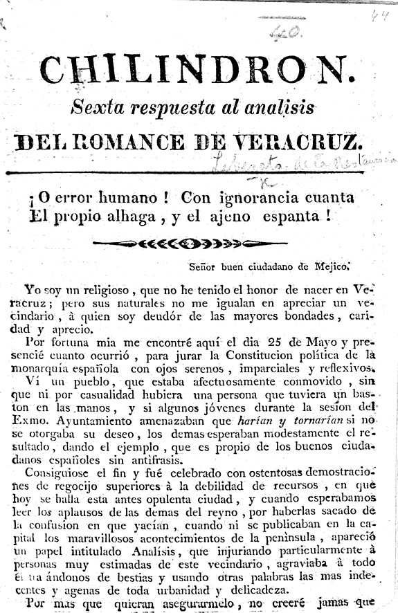 Chilindron. Sexta respuesta al Analisis del Romance de Veracruz. [Signed: Fray Liberato ee [sic] la Restauracion.]