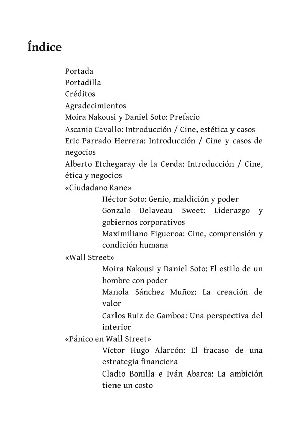 El libro analiza e interpreta las 15 mejores películas sobre negocios de todos los tiempos y las emplea como casos de estudio cubriendo una amplia gama de temas como: liderazgo, emprendimiento, gobiernos corporativos, perfiles criminales, diseño de productos, valoración de activos, psicología organizacional, innovación, estrategias de marketing y ventas, contratos financieros, negocios internacionales y derechos humanos, entre muchos otros. Es así como es posible encontrar un detallado análisis a las películas Ciudadano Kane de Orson Welles, Wall Street de Oliver Stone, Pánico en Wall Street de Glenn Jordan, Recursos Humanos de Laurent Cantet, El método de Marcelo Piñeyro, Okuribito de Yojiro Takita, El desinfomante de Stevenn Soderbergh, La familia Jones de Derrick Borte, Red social de David Fincher, Too big to fail de Curtis Hanson, La pesca de salmón en Yemen de Lasse Hallström, Margin Call de J.C. Chandor, No de Pablo Larraín, Jobs de Joshua Michael Stern y El lobo de Wall Street de Martin Scorsese.