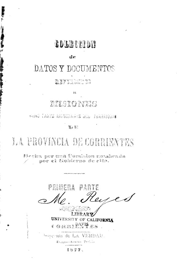 Autor: Corrientes (Argentina : Province). Comisión para coleccionar los documentos que comprueban los derechos de la provincia de Corrientes al territorio de las Misiones