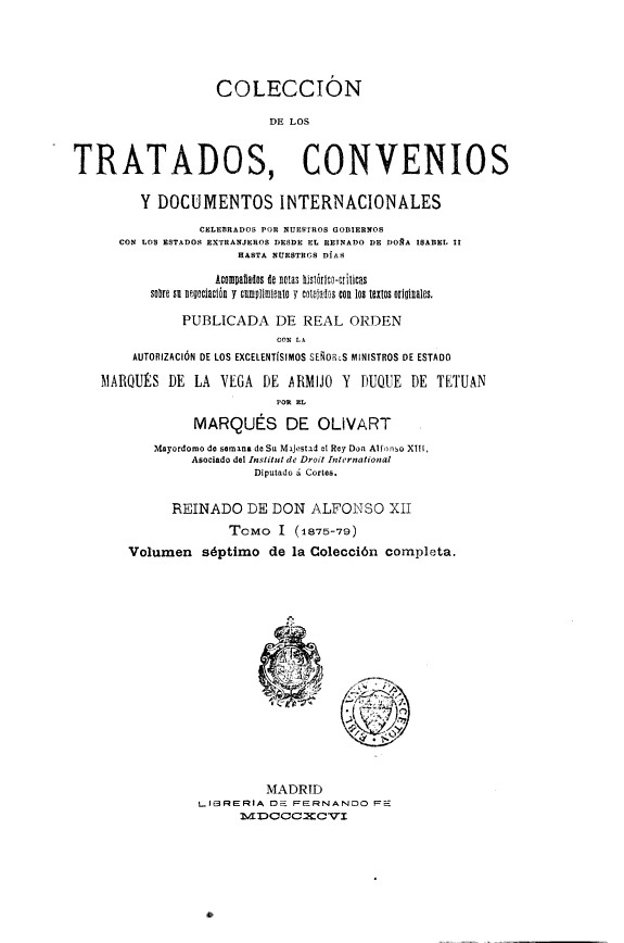 Coleccion de los tratados, convenios y documentos internationales celebrados por nuestros gobiernos con los estados extranjeros desde el reinado de dona Isabel II.