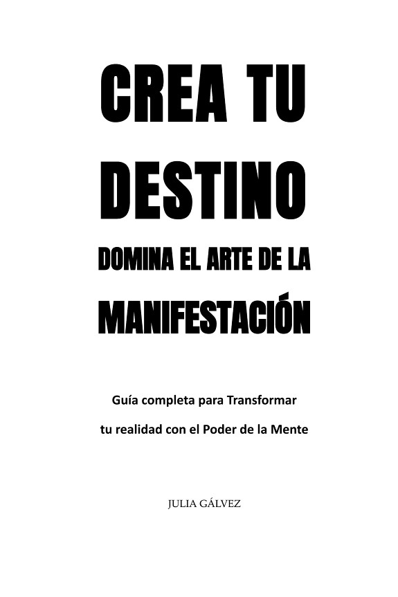 Transforma tu realidad hoy mismo con las poderosas enseñanzas del Nuevo Pensamiento y descubre el arte de la manifestación. ¡Tu destino está en tus manos! ¿Estás listo/a para descubrir el poder ilimitado de tu mente y transformar tu vida? «Crea tu Destino – Domina el Arte de la Manifestación» es tu guía esencial para dominar las técnicas del Nuevo Pensamiento y manifestar tus deseos más profundos. En este libro, Julia Gálvez te lleva de la mano a través de una serie de capítulos cuidadosamente diseñados para desbloquear tu potencial y crear una realidad llena de abundancia, salud y felicidad. Desde los fundamentos del Nuevo Pensamiento hasta las técnicas avanzadas de visualización y afirmaciones, encontrarás todo lo que necesitas para convertir tus sueños en realidad. Contenido: Tu Guía hacia el Éxito: Cómo Leer Este Libro Fundamentos del Nuevo Pensamiento La Mente Creativa según Thomas Troward Asumiendo el Estado Deseado con Neville Goddard El Juego de la Vida y Cómo Jugarlo según Florence Scovel Shinn La Ley de Atracción: Teoría y Práctica El Poder de las Afirmaciones La Visualización: Viendo para Creer El Desapego y la Confianza en el Proceso Vivir en la Abundancia Superando Bloqueos y Resistencias La Gratitud como Fuerza Creativa Aplicando el Nuevo Pensamiento en la Vida Cotidiana para Manifestar Deseos Cada capítulo de este libro está lleno de sabiduría práctica y ejemplos concretos para ayudarte a aplicar los principios del Nuevo Pensamiento en tu vida diaria. Aprenderás a elevar tu vibración, a visualizar tus metas con claridad y a utilizar afirmaciones poderosas que transformarán tu realidad. Julia Gálvez te invita a explorar, experimentar y absorber cada enseñanza con una mente abierta y un corazón dispuesto. Este libro no es solo una lectura única, sino una guía a la que podrás volver una y otra vez, cada vez descubriendo nuevas capas de comprensión e inspiración. «Crea tu Destino – Domina el Arte de la Manifestación» es más que un libro; es tu compañero en el camino hacia una vida plena y significativa. Más que HACER, se trata de SER. ¡Embárcate en este viaje de autodescubrimiento y transformación y crea la vida de tus sueños!