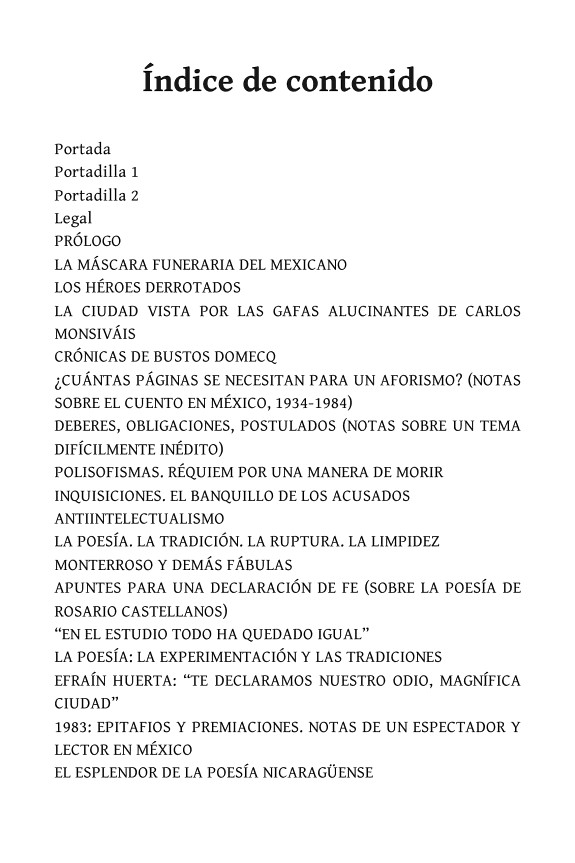 Índice Volumen 1 PRÓLOGO 11 LA NOVELA EN MÉXICO COMO EXTENSIÓN LAICA DE LA PARROQUIA 21 NOTAS SOBRE MARÍA 27 CULTURA NACIONAL Y CULTURA COLONIAL EN LA LITERATURA MEXICANA. 39 ATENTAS CONSIDERACIONES. LOS PERSONAJES AL FINAL DE LAS ALEGORÍAS. 53 AMADO NERVO. IN-A-GADDA-DA VIDA NADA TE DEBO, IN-A-GADDA-DA VIDA ESTAMOS EN PAZ . 57 INQUISICIONES. EL BANQUILLO DE LOS ACUSADOS 63 EL CONTEXTO LATINOAMERICANO 71 MÉXICO: NOTAS SOBRE LITERATURA Y SOCIEDAD (A LA HORA EXACTA DEL COLONIALISMO CULTURAL) 77 SOÑADORA, COQUETA Y ARDIENTE (NOTAS SOBRE SEXISMO EN LA LITERATURA MEXICANA) 99 REMEMBRANZAS. TUPIRLE A LA OBSOLESCENCIA 125 MEJOR SERÁ MITIFICAR EL PUEBLO (NOTAS SOBRE LA IDEA DE “PROVINCIA”) 133 PORFIRISMO Y REVOLUCIÓN. LOS DESTINOS LEGENDARIOS Y LA DIFUSIÓN CULTURAL. 141 NOTAS SOBRE LA NOVELA DE LA REVOLUCIÓN MEXICANA I 167 NOTAS SOBRE LA NOVELA DE LA REVOLUCIÓN MEXICANA II. 173 AL TÉRMINO DE LA NOVELA DE LA REVOLUCIÓN MEXICANA III. 179 EN EL CENTENARIO DEL NACIMIENTO DE MARIANO AZUELA 187 AGUSTÍN YÁÑEZ, 1904-1980 195 SÍ, TAMPOCO LOS MUERTOS RETOÑAN. DESGRACIADAMENTE 199 MAURICIO MAGDALENO: “¡MALDITA SEA ESTA TIERRA QUE NO DA NI PARA MAL FORRAJE!” 219 LA APARICIÓN DEL SUBSUELO (SOBRE LA CULTURA DE LA REVOLUCIÓN MEXICANA) 223 LAS UTOPÍAS DE ALFONSO REYES 245 JULIO TORRI: EL SEGUNDO ULISES 253 LOS ESTRIDENTISTAS 269 TRADICIÓN COMO SELECCIÓN 277 JORGE CUESTA: LAS LIBERTADES DE LA INTELIGENCIA 283 LAS CERTIDUMBRES DEL ESCALAFÓN 305 LA VIDA EN MÉXICO EN EL PERIODO PRESIDENCIAL DE SALVADOR NOVO 311 ELÍAS NANDINO. LA FIDELIDAD, LA CONTINUIDAD, LA GENEROSIDAD 339 NOTICIAS HEMEROGRÁFICAS 347
