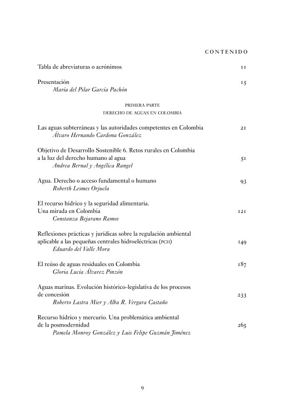 PRESENTACIÓN El derecho de aguas es una rama del ordenamiento jurídico cuyo conocimiento se hace urgente en la medida que los conflictos por el recurso hídrico se incrementan y las dificultades en la gobernanza del agua se hacen más evidentes. Es por ello que desde la academia sigue siendo relevante impulsar las investigaciones y promover la socialización del conocimiento que se genera desde el ámbito universitario. Así las cosas, el tomo VII de la colección Derecho de aguas pretende dar a conocer los resultados de la línea de investigación Derecho Ambiental General y su proyecto Derecho de Aguas, el cual ha contado en esta ocasión con la participación de diferentes expertos nacionales y extranjeros, quienes han analizado múltiples asuntos de actualidad en la materia. La obra ha sido dividida en dos partes. La primera de ellas está dedicada al derecho de aguas en Colombia, y la segunda, al estudio del derecho y la gestión de aguas en el escenario internacional. Da inicio a la primera parte del libro el artículo del profesor investigador Álvaro Hernando Cardona González, quien analiza las competencias de las autoridades ambientales en materia de exploración y aprovechamiento de las aguas subterráneas, partiendo de su naturaleza de bienes de dominio público y haciendo llamados por una intervención reglamentaria que permita una mayor tutela del recurso hídrico subterráneo. En esta ocasión dos artículos analizan el derecho humano al agua desde diferentes perspectivas. Andrea Bernal y Angélica Rangel Amado, desde las necesidades de ajuste político y normativo necesarios para el cumplimiento del sexto Objetivo de Desarrollo Sostenible (ODS), y Roberth Lesmes Orjuela, desde una perspectiva histórica.Lesmes Orjuela examina la regulación jurídica del agua en Colombia y la forma como, a través de diversos instrumentos normativos, se ha procurado la protección. Por su parte, Constanza Bejarano Ramos estudió la necesaria relación entre el agua y la producción de alimentos a través del análisis regulatorio que se ha adoptado en Colombia para procurar una gestión integrada de recursos hídricos. El investigador Eduardo del Valle Mora examinó el marco jurídico aplicable a la construcción de pequeñas centrales hidroeléctricas en Colombia. Su estudio parte de la identificación de instrumentos de comando y control aplicables, para luego centrarse en las disposiciones en materia de concesiones