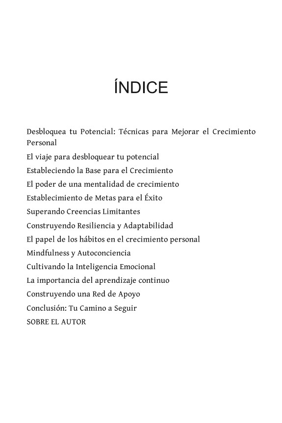 ¿Estás listo para transformar tu vida y desbloquear tu verdadero potencial? Sumérgete en “Desbloquea tu Potencial: Técnicas para Potenciar el Crecimiento Personal”, una guía completa diseñada para ayudarte a alcanzar el éxito personal y profesional. Este libro ofrece estrategias prácticas y pasos accionables para cultivar una mentalidad de crecimiento, establecer y alcanzar metas significativas, desarrollar resiliencia y fomentar la inteligencia emocional. A través de capítulos reveladores sobre la atención plena, la autoconciencia, el aprendizaje continuo y la construcción de una red de apoyo, obtendrás las herramientas necesarias para superar los desafíos de la vida y aprovechar las oportunidades de crecimiento. Ya sea que busques mejorar tu carrera, tus relaciones o tu bienestar general, este libro te brinda la orientación necesaria para iniciar un viaje enriquecedor de superación personal. Únete a los innumerables que han transformado sus vidas con los principios de este libro. Comienza hoy tu viaje y desbloquea la grandeza que llevas dentro.