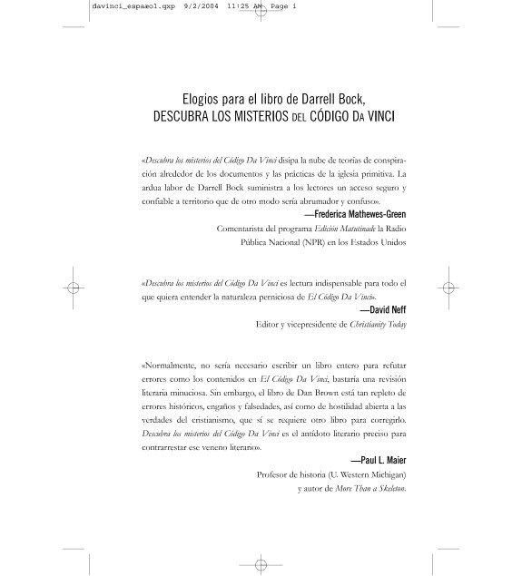Muchos de los que han leído el éxito de librería del New York Times El Código Da Vinci tienen preguntas que surgen al leer sobre los siete códigos, expresos o implícitos en el libro de Dan Brown. En el libro Descubra los misterios del Código Da Vinci, el doctor Darrell Bock, responde a las declaraciones del novelista usando textos antiguos verdaderos que revelan las respuestas a las siguientes preguntas: · ¿Quién era Maria Magdalena? · ¿Se casó Jesús? · ¿Si Jesús era soltero, se le consideraba anti judío? · ¿Será cierto que los supuestos «evangelios gnósticos secretos» nos ayudan a comprender mejor a Jesús? · ¿Cómo se formaron los evangelios del Nuevo Testamento? · ¿El honrado papel de María como apóstol calza con las afirmaciones de la nueva escuela de pensamiento? · ¿ Cuál es la relevancia que sobresale del Código Da Vinci? La investigación de Darrell Bock devela los orígenes de estos códigos enfocándose en los 325 años después del nacimiento de Cristo ya que las declaraciones del código Da Vinci se sostienen o se derrumban en base a las cosas que surgieron de este período. Descubra los misterios del Código Da Vinci hace una distinción entre lo que es un entretenimiento ficticio y los elementos históricos de la fe cristiana. Cuando el lector comprende la diferencia, entonces puede así descifrar realmente el código Da Vinci. No obstante, hay otro código que está escondido dentro de las páginas de esta novela. La mayoría de los lectores no saben que este otro código se encuentra allí. De hecho, Bock no lo notó la primera vez tampoco. Descubra los misterios del Código Da Vinci guiará a los lectores a descubrir porque esta novela se ha convertido en un fenómeno público y porque los asuntos que se hilvanan en ella son dignos de estudio y reflexión cuidadosa.