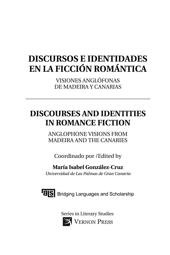Despreciado por la crítica por su condición de literatura popular y femenina, el género romántico no solo continúa imbatible en el mercado editorial con su elevado índice de ventas, sino que en las últimas décadas está siendo objeto de interesantes estudios académicos. «Discursos e Identidades en la Ficción Romántica» se suma a esta corriente, al abordar el análisis interdisciplinar de un corpus de novelas publicadas en lengua inglesa entre 1955 y 2004. Ambientados en las islas atlánticas de Madeira y Canarias, estos textos encierran una variedad de discursos que ponen de manifiesto una visión muy anglófona de los lugares visitados por las protagonistas. Además del esperado discurso de género, en sus páginas se detecta un discurso del paraíso que resalta el exotismo de las islas, despertando en ocasiones la concienciación medioambiental, aunque también se perciben actitudes lingüísticas e incluso raciales, a medida que las autoras indagan en el descubrimiento del Otro. Ni los personajes ni los narradores son ajenos al choque de identidades y al contacto lingüístico (anglo-español y anglo-portugués), de manera que los conflictos que generan la identidad nacional, la identidad de género y la identidad étnica se vislumbran claramente tras la aparente sencillez de la intriga amorosa de este tipo de novelas. Disdained by critics for its status as popular and feminine literature, romance fiction not only remains unbeatable in the publishing market in terms of sales, but has also been the subject of interesting academic studies in recent decades. «Discourses and Identities in Romance Fiction» joins this trend by addressing the interdisciplinary analysis of a corpus of novels published in English between 1955 and 2004. Set on the Atlantic islands of Madeira and the Canaries, these texts develop a variety of discourses that reveal a very Anglophone vision of the places visited by their protagonists. In addition to the expected gender discourse, these romances tend to include a paradise narrative that highlights the exoticism of the islands, sometimes awakening environmental awareness. Linguistic and even racial attitudes also come to the forefront, as the writers explore and describe the features of the Other. Neither the characters nor the narrators are oblivious to the clash of identities and the linguistic contact (English-Spanish and English-Portuguese) exposed in this type of novels, revealing the conflicts generated by national, gender and/or ethnic identities behind the apparent simplicity of their love plots.