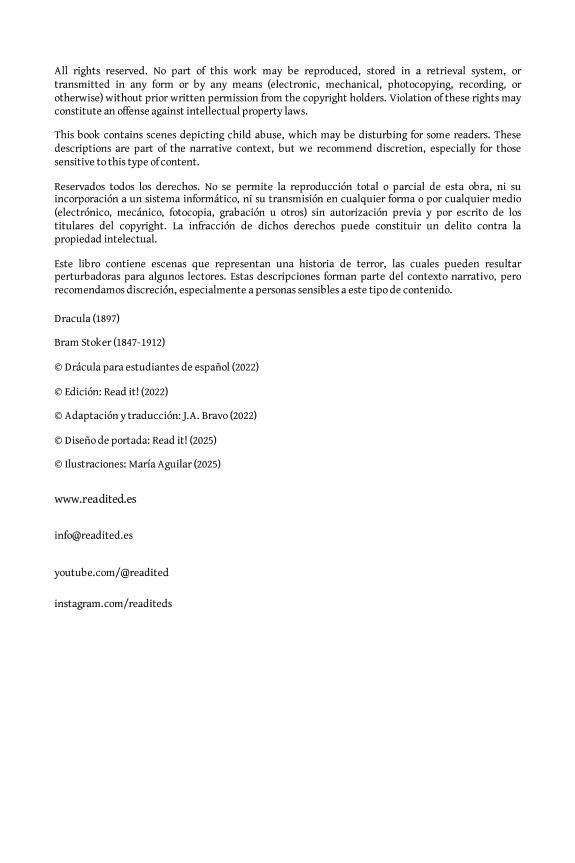 Sumérgete en el misterio y el terror con Drácula, la novela que ha fascinado a millones, ahora adaptada especialmente para estudiantes de español. Esta versión está pensada para nivel A1-A2 – Principiantes, y te ayuda a seguir la lectura con facilidad: ✅ Frases claras y comprensibles ✅ Vocabulario adaptado ✅ Ritmo narrativo fluido 🦇 Aprende español mientras entras en la historia del vampiro más famoso: un castillo oscuro, noches sin fin y una lucha entre el bien y el mal. Vive el miedo, la valentía y el misterio junto a personajes inolvidables. Porque leer en otro idioma no tiene por qué ser difícil… ¡Solo necesitas una historia que no puedas dejar de leer! Esta edición ha sido cuidadosamente adaptada para que disfrutes del clásico de Bram Stoker sin perder su esencia, su emoción y su atmósfera única. No es una traducción literal: es una reescritura pensada para ti, basada en el Marco Común Europeo de Referencia para las Lenguas (MCER), Nivel A1-A2 – Principiantes. Dive into mystery and horror with Dracula, the novel that has fascinated millions, now specially adapted for Spanish learners. This version is designed for A1-A2 – Beginners level, making it easy to follow: ✅ Clear and simple sentences ✅ Adapted vocabulary ✅ Smooth narrative flow 🦇 Learn Spanish as you enter the story of the most famous vampire: a dark castle, endless nights, and a battle between good and evil. Experience fear, courage, and mystery alongside unforgettable characters. Because reading in another language doesn’t have to be hard… You just need a story you can’t put down! This edition has been carefully adapted so you can enjoy Bram Stoker’s classic without losing its essence, emotion, and unique atmosphere. It’s not a literal translation: it’s a rewrite designed for you, based on the Common European Framework of Reference for Languages (CEFR), Level A1-A2 – Beginners.