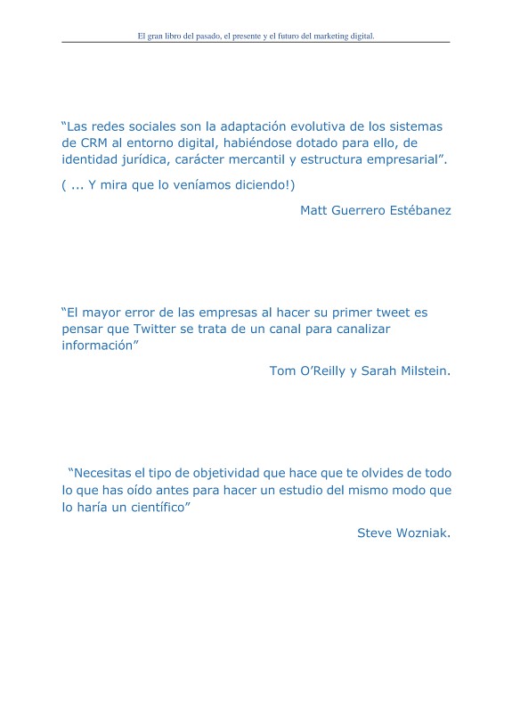 Este libro es parte de la serie de publicaciones profesionales, Informes de Management Digital, en la que se realiza un repaso a los conceptos más relevantes del ámbito económico global y digital. El gran libro del pasado, presente y futuro del marketing digital expone las claves que explican los principales aspectos a tener en cuenta, a la hora de comprender la performance de negocio, del sector del marketing digital, desde la óptica analítica de los principales informes BIG4 y de audiencia, tanto nacionales como internacionales. Se ponen en valor algunas de las predicciones de marketing más potentes del ámbito científico académico, y se relacionan con realidades de negocio pasadas, presentes y futuribles, en ocho capítulos de interés creciente. El libro integra las investigaciones comerciales que componen los dos libros anteriores de la serie Informes de Management Digital, con contenidos novedosos sobre performance de mercado, realidad legal y predicciones de negocio.