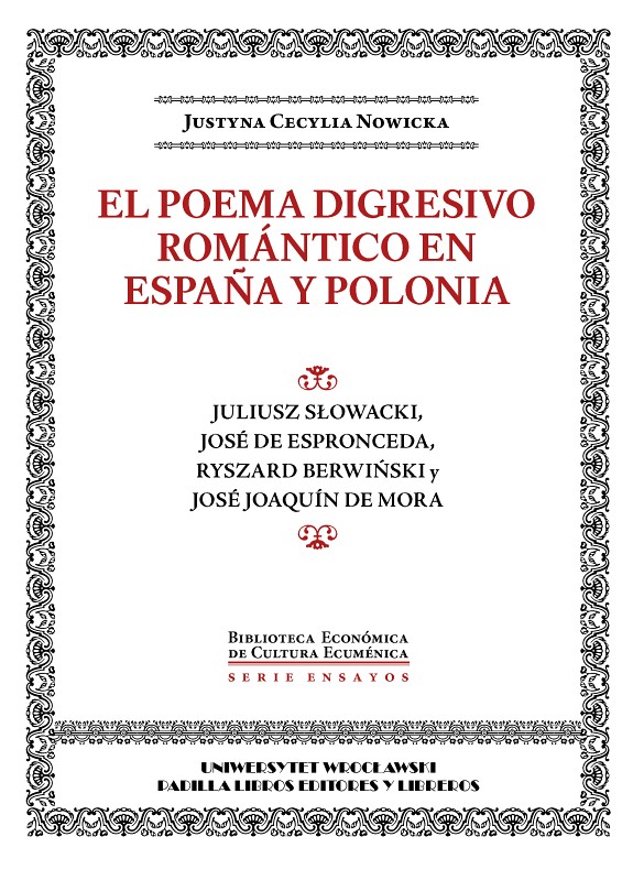A través del poema digresivo se muestran los aspectos vitales del romanticismo, ante la circunstancia de que abarca y plasma la totalidad de la evolución del sujeto, así como de la lírica y la épica románticas. Este libro constituye una introducción a la compleja temática relacionada con él, tanto en lo que atañe a sus características generales, como en lo que es específico de las literaturas española y polaca de la época. Para ello, se proponen cuatro obras, dos españolas y dos polacas: El diablo mundo de José de Espronceda, Don Opas de José Joaquín de Mora, Beniowski de Juliusz Słowacki y Don Juan Poznański de Ryszard Wincenty Berwiński. La razón para aunarlas y contrastarlas es el hecho de que mantengan una técnica narrativa similar y compartan muchos otros elementos característicos del poema digresivo, como se verá a lo largo de este trabajo. Editado por Facultad de Letras de la Universidad de Wrocław y Padilla Libros.