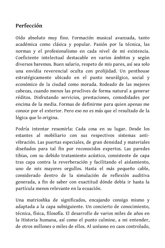 ¿Qué harías para lograr la perfección? Si requiriese aislamiento, soledad, incomprensión por parte del resto de la sociedad, ¿aceptarías? En este relato veremos la historia de alguien que tenía un sí por respuesta muy clara a esas preguntas. Un paseo por el mundo oculto detrás de la audiofilia, la pasión por la fidelidad auditiva y la técnica detrás de la acústica, entraremos en la mente de uno de sus expertos. Una persona con fascinación absorta y un oído refinado, preparado a fin de captar hasta los detalles más difíciles de escuchar para el resto de los mortales. Un elegido entre una turba de ignorantes sonoros, «sordos» como se les llama en la jerga. O al menos así es como se ve a sí mismo. Su manto de perfección impoluta será puesto a prueba por un desperfecto, falla, distorsión. Un rival inesperado sin explicación alguna, que escapa a todos los elementos de control. Una grieta que mancha el placer de un equipo especial y deja inservible la habitación con tratamiento acústico. Cuando el enigma se haga más grande y niegue toda posibilidad de arreglo, la cordura será lo que se vea en riesgo. Memorias de sacrificios, gastos monetarios y emocionales. Peajes en el camino que traza la obsesión por la más noble de las artes, según su educada opinión. Una metáfora del aislamiento. Los peligros de distanciarse del resto de la humanidad. Los costes personales que se dejan por nutrir una pasión y la delgada línea entre la perfección y la locura. Cuando el tejido de la realidad se compromete, y lo que consideramos certero trastabilla, ¿podremos encontrar la salida? Nuestro protagonista se dejará buena parte de su sanidad mental en ello, sacando a la luz varias oportunidades en las que su compulsión por el audio lo arrastró a costas oscuras.
