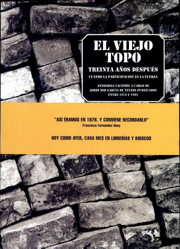 Se han cumplido ya 30 años de la aparición de El Viejo Topo. La revista irrumpió en los quioscos en noviembre de 1976, tras casi dos años de peleas con el Ministerio de Información para conseguir el imprescindible permiso. Para sorpresa de todos, el éxito fue fulminante. Se alcanzó rápidamente una tirada (real) por encima de 30.000 ejemplares, con picos que alcanzaron los 50.000. ¿Las causas? Seguramente su contenido, tan radical como plural; la priorización del debate por encima del axioma dogmático; la apertura a los entonces nuevos movimientos (feminismo, ecologismo, liberación sexual, etc.); el tratamiento de la cultura y la contracultura; el respeto a la disidencia; un diseño entonces tan innovador que consiguió el premio Laus… No fue, sin embargo, un camino de rosas: las visitas a los juzgados fueron frecuentes (por atentar a la seguridad interna del Estado, nada menos); los secuestros de ejemplares por la policía, el pan nuestro de cada día; alguna amenaza de bomba; y, para rematar la faena, el intento de captura de uno de sus co-directores por parte de un grupo paramilitar armado el día del tejerazo. Al final, sin embargo, todo quedó en agua de borrajas y la revista prosiguió su andadura. Ahora, para celebrar esos treinta años, Jordi Mir ha efectuado una antología con algunos de los textos más interesantes de aquellos años, que se reproducen aquí en edición facsímil. Son textos que dibujan, mejor que cualquier ensayo, cómo éramos y cuáles eran nuestros sueños en aquellos creativos y vibrantes años setenta. Y que también nos muestran el tamaño de la derrota.