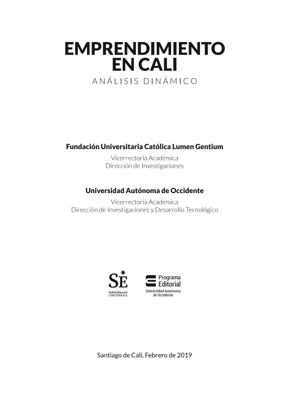 El tema del emprendimiento empresarial ha sido objeto de investigación en las últimas décadas. La razón radica en la necesidad que tienen los países de aumentar la producción de bienes y servicios para satisfacer las necesidades de una población mundial en crecimiento y todavía con grandes grupos en situación de pobreza. Adicionalmente, los avances en materia de innovación han permitido el surgimiento de exitosas empresas en nuevos sectores de la economía, lo cual, a la vez, ha estimulado la inversión en proyectos empresariales enfocados a la generación de nuevos bienes y servicios para satisfacer necesidades recientes. Emprendimiento en Cali. Análisis Dinámico, recopila un conjunto de trabajos sobre emprendimiento empresarial, producto de una investigación realizada conjuntamente por investigadores de la Universidad Autónoma de Occidente y Fundación Universitaria Católica Lumen Gentium – Unicatólica, en la ciudad de Cali, sobre la situación actual, las tendencias, los logros, las falencias y las perspectivas de los emprendedores empresariales.