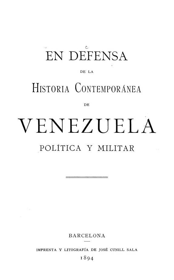 Responding to criticism of the author’s Historia contemporánea de Venezuela, expressed by Dr. Nicomedes Zuloaga in El tiempo (Caracas), and by Guzmán Blanco in his En defensa de la causa liberal (Paris : Lahure, 1894).