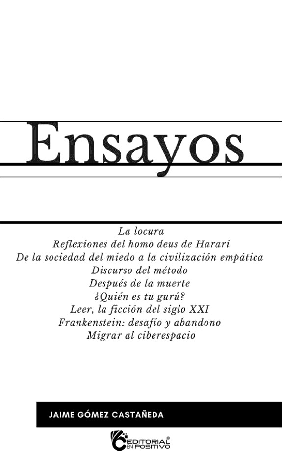 Ensayos, es una mirada a los temas que más me han inquietado, entre 2019 y 2021. Entre las fuentes de conocimiento que les dan sustento a estas líneas, están: la psicología, sociología, historia, neurociencia, filosofía, psicoterapia, tanatología, tecnología de la información, literatura y antipsiquiatría. Temas diversos que llevarán al pensamiento y las emociones por caminos diversos, quizás, por donde no se había transitado. Es la finalidad de esta colección de ensayos, permitir que la mente vague por otros caminos para ampliar el bagaje conceptual y las fronteras del conocimiento personal como social. En esta obra se incluyen los ensayos: La locura, Reflexiones del Homo Deus de Harari, De la sociedad del miedo a la civilización empática, Discurso del método, Después de la muerte, ¿Quién es tu gurú?, Leer, la ficción del siglo XXI, Frankenstein: desafío y abandono y, Migrar al ciberespacio.