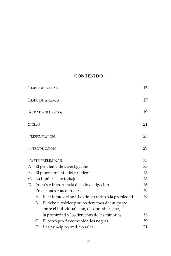 En esta obra se propone el estudio del derecho a la propiedad colectiva de las comunidades negras de Colombia como un derecho sui géneris. La reflexión propuesta al lector se constituye en un espacio teórico de revisión de algunas figuras reconocidas en la normatividad y utilizadas por las comunidades negras como la venta, el aprovechamiento de recursos naturales, el usufructo, el arrendamiento de terrenos, la existencia de propiedad privada, la familia como eje central de la conceptualización del derecho a la propiedad, las funciones de los consejos comunitarios y el uso de mecanismos internos para la resolución de tensiones, entre otros.