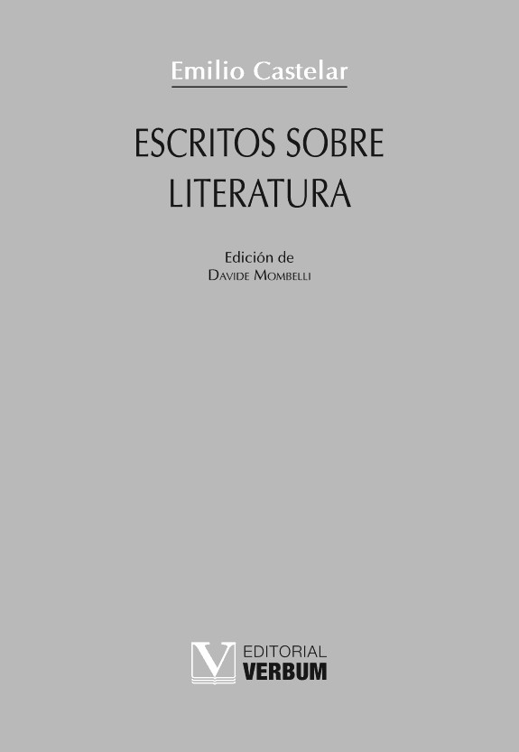 La producción de Castelar es muy extensa y, comúnmente, es solo recordada en su brillante faceta oratoria. La presente selección cubre un vacío, puesto que no solo escasean las compilaciones bien formadas sino que aún carecemos de una edición de obras completas del autor, al tiempo que, de otra parte, pone a disposición del lector una selección coherente y específica de textos. Estos, provenientes de obras de diferente género y estilo (discursos académicos, reseñas, lecciones, biografías, ensayos…), versan todos sin embargo sobre autores, temas o asuntos literarios, y arrojan luz en consecuencia sobre un aspecto fundamental y todavía casi en la sombra de uno de los más importantes intelectuales del siglo XIX español.
