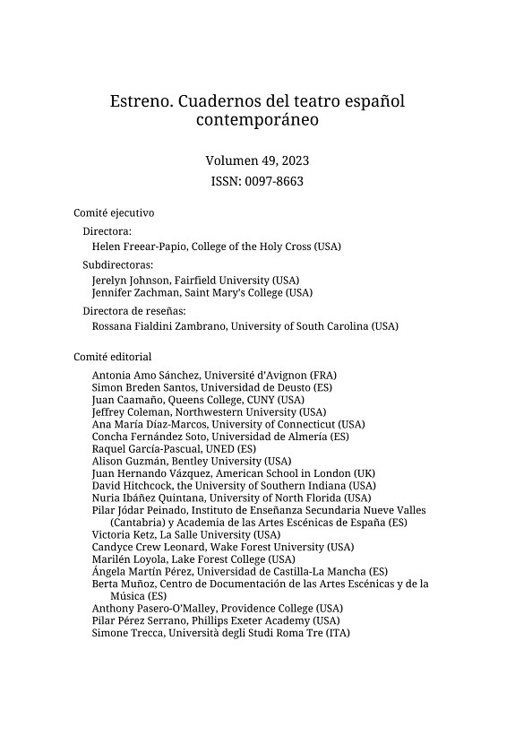 Este número de Estreno contiene la obra teatral Descarriadas de Laila Ripoll, una serie de estudios críticos sobre el teatro español contemporáneo y una sección amplia de reseñas.