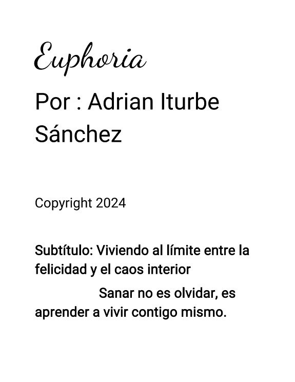 Sinopsis Viviendo al límite entre la felicidad y el caos interior Sanar no es olvidar, es aprender a vivir contigo mismo. El escritor Adrián Iturbe Sánchez, reconocido por el éxito de su libro Ángeles, El Guardián Del Amor y Secretos de los ANGELES, presenta EUFORIA/EUPHORIA, su obra más audaz e innovadora hasta la fecha. Este es el primer libro de su tipo que se atreve a declarar que ni el psicólogo ni el psiquiatra tienen la llave para tu sanación; solo tú puedes curarte. Euphoria explora profundamente los rincones del alma humana y los problemas que todos enfrentamos, proponiendo una perspectiva única: la verdadera curación surge de enfrentar los problemas de frente, no de esquivarlos ni de vivir con una disciplina rígida. Este libro invita a aprender a vivir desde lo más íntimo de uno mismo, a deslindarse de la perspectiva de quien vive en primera persona y adoptar una visión externa que permita ver los problemas con claridad, afrontarlos y trascenderlos.
