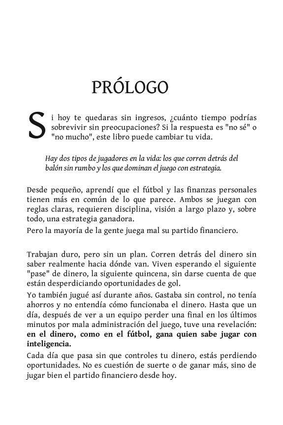Si hoy te quedaras sin ingresos, ¿cuánto tiempo podrías sobrevivir sin preocupaciones? Si la respuesta es «no sé» o «no mucho», este libro puede cambiar tu vida. Hay dos tipos de jugadores en la vida: los que corren detrás del balón sin rumbo y los que dominan el juego con estrategia. Desde pequeño, aprendí que el fútbol y las finanzas personales tienen más en común de lo que parece. Ambos se juegan con reglas claras, requieren disciplina, visión a largo plazo y, sobre todo, una estrategia ganadora. Pero la mayoría de la gente juega mal su partido financiero. Trabajan duro, pero sin un plan. Corren detrás del dinero sin saber realmente hacia dónde van. Viven esperando el siguiente «pase» de dinero, la siguiente quincena, sin darse cuenta de que están desperdiciando oportunidades de gol. Yo también jugué así durante años. Gastaba sin control, no tenía ahorros y no entendía cómo funcionaba el dinero. Hasta que un día, después de ver a un equipo perder una final en los últimos minutos por mala administración del juego, tuve una revelación: en el dinero, como en el fútbol, gana quien sabe jugar con inteligencia. Cada día que pasa sin que controles tu dinero, estás perdiendo oportunidades. No es cuestión de suerte o de ganar más, sino de jugar bien el partido financiero desde hoy. Este libro no es un manual aburrido de finanzas. No te hablaré de términos complicados ni te haré sentir que necesitas ser un experto en economía para manejar bien tu dinero. Este es un libro sobre cómo ganar el partido financiero usando algo que ya entiendes: el fútbol. Si amas el fútbol, aprenderás de finanzas sin darte cuenta. Si quieres mejorar tus finanzas, aquí encontrarás la mejor estrategia para hacerlo. A lo largo de estas páginas, recorreremos juntos la historia del Atlético Ahorro, un equipo que pasó de ser un desastre sin rumbo a convertirse en campeones gracias a la misma estrategia que usan las personas financieramente exitosas. Descubrirás cómo proteger tu portería (presupuesto y ahorro), construir un mediocampo sólido (inversiones inteligentes) y contar con una delantera letal (múltiples fuentes de ingresos). No hay nada peor que llegar al final del partido y darte cuenta de que pudiste haber jugado mejor. No permitas que eso te pase con tu dinero. Porque el dinero, al igual que el fútbol, no se trata de correr más rápido, sino de jugar con inteligencia. Así que ponte los botines, ajusta las espinilleras y prepárate. Es hora de salir a la cancha y empezar a ganar el partido financiero.