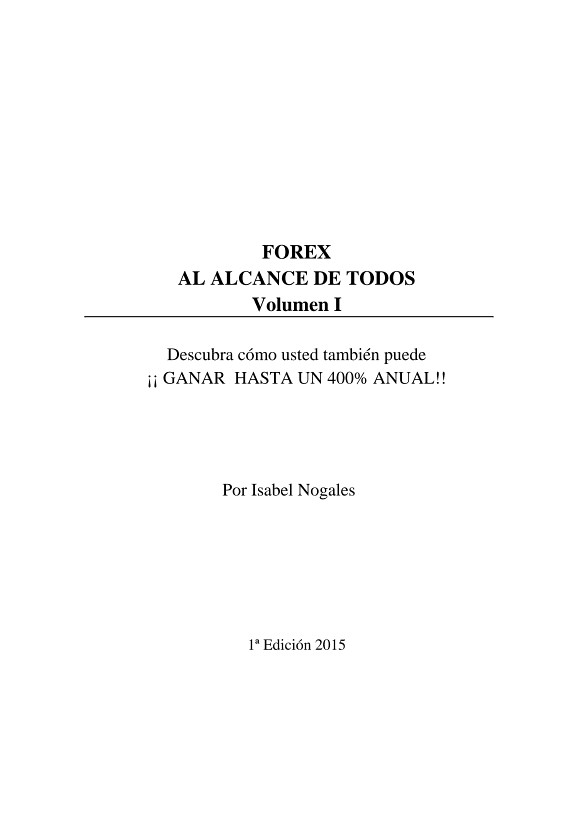 VIVIR DEL FOREX ES POSIBLE y ¡¡ ALTAMENTE LUCRATIVO!!…. Si tienes un BUEN MAESTRO que te guíe en el proceso. La mayoría de gente que se inicia en la inversión en los mercados financieros, lo hace de forma poco meditada y sin muchos conocimientos previos. Aprenden a base de tropiezos, influenciados por sus sesgos psicológicos y en el mejor de los casos, compartiendo experiencias con otras personas en su misma situación… resultando un auténtico desastre financiero. Si tienes interés en conocer este mundo y conseguir ¡¡HASTA UN 400% SOBRE TU INVERSIÓN INICIAL!! Adquiere éste libro. En él te enseñaré como BATIR LOS MERCADOS, de manera consistente, no por un golpe de suerte, sino con conocimientos, haciendo del FOREX tu CAJERO PERSONALIZADO, o incluso TU MODO DE VIDA… si lo prefieres. “FOREX AL ALCANCE DE TODOS” te enseñará paso a paso CÓMO OPERAR CON ÉXITO EN EL APASIONANTE MUNDO DEL FOREX y te formará desde tus inicios en FOREX hasta convertirte en un TRADER PROFESIONAL. Si quieres empezar a invertir en FOREX y ¡¡Conseguir ser Rentable Mes a Mes!! , te recomiendo encarecidamente que compres este e-book y lo leas las veces que sea necesario. Es mas te invito a que adquieras la versión impresa, lo estudies, subrayes y realices todas las anotaciones en él que consideres oportunas… porque este libro va a convertirse, en las próximas semanas, en tu PASAPORTE AL ÉXITO FINANCIERO. Y no querrás deshacerte de él. Lo mejor de todo: ¡¡Lo que aquí aprendas es aplicable en cualquier mercado financiero!! ¡¡Imagínate el potencial.!! Merece la pena que tu primera inversión sea en un buen libro de FOREX como el que aquí te presento. Adquiere “Forex al Alcance de Todos” ¡¡YA MISMO!! y marca ESTE DÍA EN EL CALENDARIO COMO EL PRIMERO DE TU NUEVA VIDA