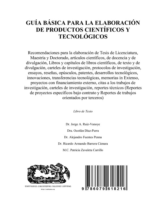 En este libro de texto se presentan unas Recomendaciones para la elaboración de Tesis de Licenciatura, Maestría y Doctorado, artículos científicos, de docencia y de divulgación, Libros y capítulos de libros científicos, de texto y de divulgación, carteles de investigación, protocolos de investigación, ensayos, reseñas, opúsculos, patentes, desarrollos tecnológicos, innovaciones, transferencias tecnológicas, memorias in Extenso, proyectos con financiamiento externo, citas a los trabajos de investigación, carteles de investigación, reportes técnicos (Reportes de proyectos específicos bajo contrato y Reportes de trabajos orientados por terceros).