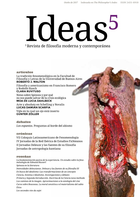 Artículos de Roberto Walton, Clara Ruvituso, Moa Dahlbeck, Lucas Scarfia y Günter Zöller. Un debate intenso en torno a Los espantos, de Silvia Schwarzböck. Un editorial sobre la dramática coyuntura. Además, crónicas y reseñas. Descarga gratuita: http://revistaideas.com.ar/descargas/ Participan en el debate: Guadalupe Lucero, Javier De Angelis, Fernando Svetko, German Gallino, Negro José, Julian Ferreyra, Mariano Gaudio, Rodrigo Paez Canosa y G.I. Míguez. Escriben crónicas: Alan Patricio Savignano, Micaela Szeftel, Mariano Gaudio, Rafael Mc Namara, Gonzalo San y Melina Alexia Varnavoglou. Reseñan Micaela Szeftel, María Jimena Solé, Santiago Lo Vuolo, Javier Echarri, Federico Vicum, Guadalupe Lucero, Jorge Čorč Lucero, Marcos Travaglia y Andrés Goldberg. El diseño gráfico, como siempre, es de Juan Pablo Fernandez