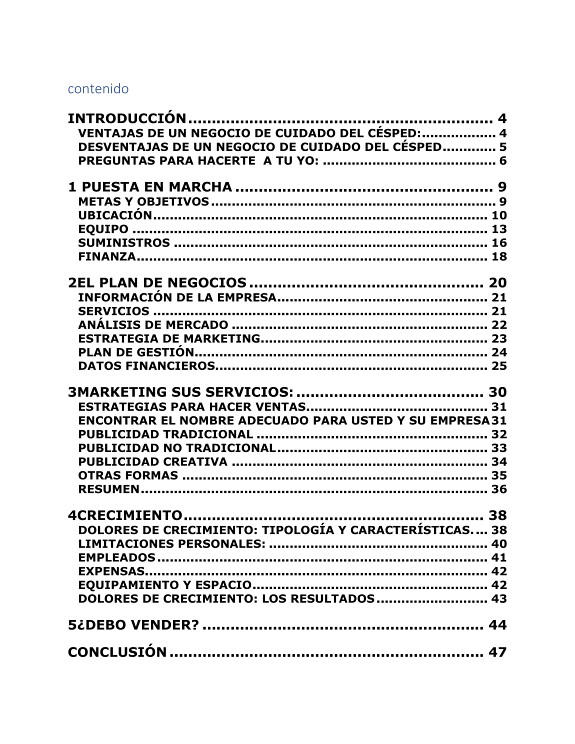 ¿Quieres ser tu propio empleador? ¿Crees que podrías manejar tu propio negocio? Además, ¿está interesado en construir un negocio que luego pueda vender por más de lo que pagó? Si es así, debería considerar iniciar un negocio de cuidado del césped. Un negocio de cuidado del césped le ofrece la oportunidad de tener éxito financiero a través del trabajo por cuenta propia. De hecho, involucrarse en este tipo de negocios tiene muchas ventajas. Van desde la independencia hasta la baja entrada de efectivo y la facilidad de entrada. A continuación se muestran algunos de los temas cubiertos: • Anticipando problemas para su negocio de cuidado del césped • Tan fuerte como su eslabón más debit • Rentabilización en su negocio de cuidado del césped • Creando el nombre perfecto para su negocio de cuidado del césped • Competir por los clientes del cuidado del césped • Hacer lo que ama para ganarse la vida • Los empleados son la columna vertebral de su negocio de cuidado del césped • Gratis es bueno en el negocio del cuidado del césped • Financiamiento de su nuevo negocio de cuidado del césped • Hacer correr la voz sobre su nuevo negocio de cuidado del césped • No se trata del césped. Se trata del cliente • Mantener su negocio de cuidado del césped funcionando todo el año • Elimine los calcetines de sus clientes de cuidado del césped con el servicio de atención al cliente • Conociendo las cuerdas • Aprender los trucos del marketing para su negocio de cuidado del césped • Un paso por delante del éxito • Iniciar un negocio de cuidado del césped no tiene por qué costar nada • Iniciar un negocio de cuidado del césped por todas las razones correctas • Las alegrías y las dificultades de trabajar para usted mismo • Los pasos para iniciar un negocio de cuidado del césped • Las herramientas del oficio • Venta adicional a sus clientes de cuidado del césped • Y mucho más… ¡Ponte en marcha ahora mismo!