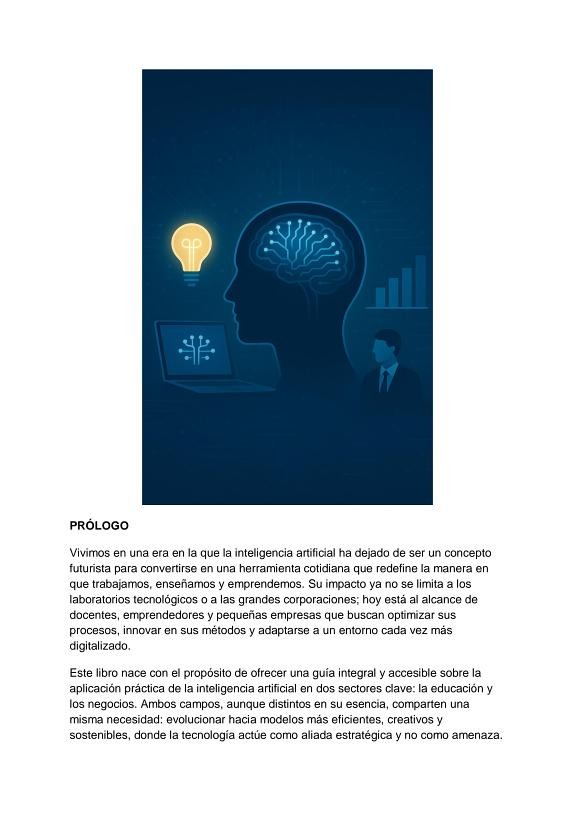 La Inteligencia Artificial ha dejado de ser una promesa tecnológica para convertirse en una herramienta esencial en la transformación educativa y empresarial. Este libro ofrece una visión clara, estructurada y práctica sobre cómo aplicar la IA de manera efectiva en la enseñanza, la gestión y la innovación de las pequeñas y medianas empresas. Inteligencia Artificial Aplicada: Educación y Negocios del Futuro presenta un recorrido completo por los conceptos fundamentales, las aplicaciones más útiles y las herramientas accesibles que permiten integrar la IA en el trabajo cotidiano de docentes, formadores, emprendedores y directivos. Con un enfoque orientado a la práctica, se abordan temas como la automatización de tareas educativas, la personalización del aprendizaje, la analítica de datos, la gestión inteligente de recursos, la comunicación digital, el marketing automatizado y la toma de decisiones basada en datos. El lector encontrará ejemplos reales, recursos digitales, estrategias de implementación y guías paso a paso para aprovechar la IA sin necesidad de conocimientos técnicos avanzados. Cada capítulo combina teoría aplicada, buenas prácticas y soluciones concretas para mejorar la productividad, la creatividad y la eficiencia. Este manual se convierte así en una herramienta imprescindible para quienes buscan comprender, aplicar y liderar la transformación digital con inteligencia, tanto en el aula como en el mundo empresarial.