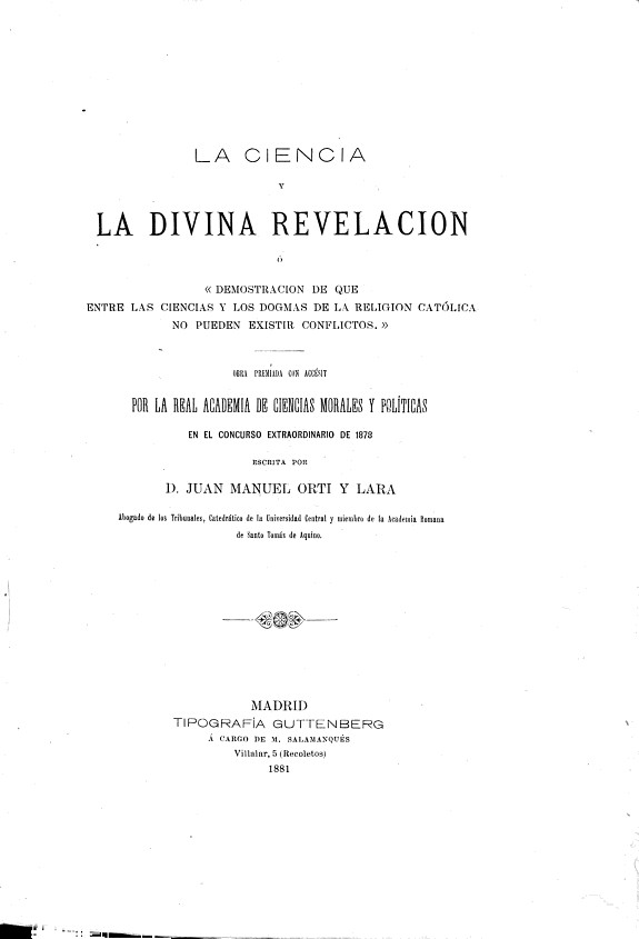 La ciencia y la divina revelacion, o: Demostracion de que entre las ciencias y los dogmas de la religion católica no pueden existir conflictos