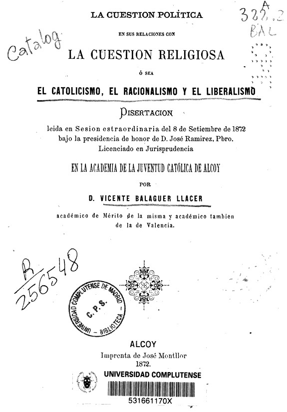 La cuestión política en sus relaciones con la cuestión religiosa ó sea el catolicismo, el racionalismo y el liberalismo