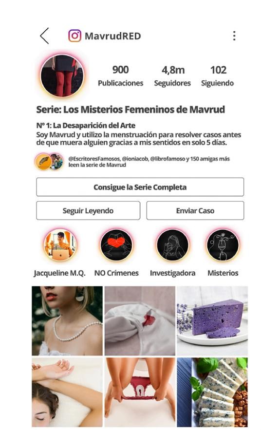 ♥ Soy Mavrud y utilizo la menstruación para resolver casos antes de que muera alguien gracias a mis sentidos en solo 5 días. No soy Belga ni estuve en la guerra. No soy inglesa ni me excitan los asesinos en serie. Soy rusa y evito que las mujeres acaben siendo un cadáver y el protagonista su asesino. No resuelvo casos de víctimas sino de mujeres cuyas vidas cambian drásticamente y necesitan la ayuda de otra mujer que no las juzgue, ni critique o las llame «exageradas», sino que resuelva el misterio del cambio de su vida. Nº 1 de la Serie – La Desaparición del Arte: Feli, es una chica que ha perdido el talento de pintar después de la Pandemia. Mi misión es averiguar si sigue pintando y por qué dejó atrás su arte. Esta aventura me llevará al país que mas ha sufrido en el cierre mundial del 2020. Acompañada por vinos, comidas deliciosas y personajes que esconden mas de un secreto. ★ Recomendaciones de la Autora Jacqueline M.Q. ★ ◆ Condiciones de Lectura La única sangre que hay aquí es de Menstruación, por lo que si buscas leer sobre crímenes o mujeres descuartizadas, definitivamente este no es tu libro. Los misterios que aquí se resuelven son para evitar que sucedan esta clase de historias. En pleno Siglo XXI deberíamos saber como evitar un marido asesino, una hija vengativa o una pelea domestica que acaba haciéndose viral en las redes sociales. Los misterios de Mavrud son para quienes disfrutan descubriendo los secretos de aquellas mujeres que cambian drásticamente su comportamiento y otras mujeres se preocupan por ellas, amigas, madres, hermanas, tías… esa es la clase de misterios que existen en esta Serie. Si aceptas que no vas a leer un misterio convencional, adelante, espero que seas la siguiente Mavrud. ◆ Leer si no Menstrúas En este libro leerás sobre la Menstruación ya que el misterio gira en torno a la regla de Mavrud. Por lo que al igual que la menstruación no es opcional, no está permitido opinar ni calificar los sentidos de Mavrud ni otorgarle los siguientes adjetivos: -Exagerada. -Extremista. -Caprichosa. -Mimada. Hasta que no sepas lo que se siente al tener la menstruación, tu opinión al respecto no cuenta. Solo puedes disfrutar leyendo este misterio femenino acerca de la belleza y el don de los sentidos que se nos otorga a las mujeres cada mes. Para Mavrud se convierten en un Superpoder que utiliza para que los casos que recibe en Instagram no acaben en una tragedia “resuelta” por hombres. ◆ Sobre el Diseño de este Libro Mavrud ha sido escrita y diseñada para crear el «Efecto Aquí y Ahora». Por lo que el lenguaje es el presente igual que muchos sucesos que van ocurriendo a lo largo de la serie. Igualmente el diseño está inspirado en aquello que utilizamos hoy, desde crear Historias en Instagram, notas del celular, enviar mensajes por WhatsApp o Telegram. Este diseño y escritura lo he utilizado para poder transmitir mis emociones en directo ya que al igual que Mavrud resuelve misterios solo cuando tiene la menstruación, yo solo la escribo en mis 5 días de regla. Cada mes es diferente, igual que sus casos, emociones e incluso a veces sus ideales. Con este efecto deseo mostrar lo hermosa que somos las mujeres y fuertes gracias a la menstruación, la cual nos intentan ocultar desde que surge en nosotras. Es un Superpoder, un don que solo tenemos nosotras. ♥ Si aceptas que no vas a leer un misterio convencional, adelante, espero que seas la siguiente Mavrud.