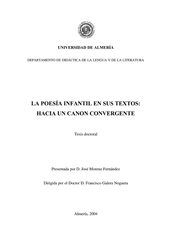 La tesis trata de poner en contacto los niveles de referencia que asisten a unos textos poéticos destinados a primeros lectores con las poéticas globales de donde surgen, aspecto no siempre considerado dentro de una determinada tradición literaria. A la vez, pretende sacar a flote una serie de pervivencias poéticas en las que pueda basarse una competencia literaria fiable y adecuada. Partiendo de los núcleos abordados en cada una de las tres secciones en que se divide -obras de creación y antologías y libros escolares para niños-, la investigación trata de aunar en su configuración la dimensiones filológicas y didácticas con las que difícilmente se viene caracterizando su estudio. El marco referencial del primer capítulo (“Un ciclo poético en el último humanismo literario: de poemas niños a poemas infantiles”) aparece determinado por la línea que describe Ma Luisa Muñoz de Buendía desde Bosque sin salida hasta La Princesita de la Sal. En su evolución se dan cita asimismo otras aportaciones, algunas tan decisivas como las “Nanas de la cebolla” de Miguel Hernández, El sol, la luna y las estrellas de Salvador de Madariaga y Tarde de circo de Jaime Ferrán. El siguiente apartado -“Selecciones de poesía para niños en la segunda mitad del siglo XX”- intenta ofrecer una panorámica de las principales antologías de poesía surgidas en dicho periodo; es el caso, entre otras, de Cordialidades, Poesía infantil recitable, Versos para niños, Selección de poesía para niños, El silbo del aire, Poesía española para niños y Canto y cuento. La tercera y última parte -“Poesía para niños en textos escolares”- se centra, finalmente, en las perspectivas que sugiere el canon formativo, estudiado aquí en función de los parámetros aportados por un centenar de textos escolares, todos ellos provenientes de los Ciclos Renovados de EGB y Educación Primaria.