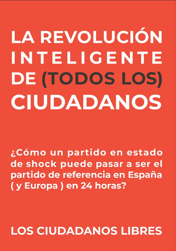 La edición actual del libro es un adelanto de la versión definitiva. Se invita a todos los ciudadanos que quieran enviar sus comentarios y, sobre todo, mejoras, a que lo hagan a hola@losciudadanoslibres.es. En esta primera versión de 380 páginas (DIN A4) se explica: 1. Por qué es absolutamente necesario que España se convierta en el país líder de las sociedades inteligentes del conocimiento si quiere salir de la mediocridad 2. Por qué CIUDADANOS se ha convertido en 2 años en otro partido analógico envejecido al que los votantes consideran inútil 3. Por qué CIUDADANOS debería convertirse en un partido ‘inteligente’ que impulse la transformación inteligente de España si no quiere desaparecer 4. Que significa ser un país y un partido inteligente en el siglo XXI, en el momento de cambio de paradigma social por las identidades inteligentes, la inteligencia artificial, la ciencia de los datos… 5. Qué MARCO ESTRATÉGICO hay que desarrollar, y cómo, para realizar ambas transformaciones 6. Qué cambios en su visión, misión, competencias y adaptación de valores hacia un liberalismo del siglo XXI (que no es lo mismo que un liberalismo en el siglo XXI) tiene que hacer CIUDADANOS para convertirse en un partido de referencia del siglo XXI Se incluyen 2 documentos y un libro: DOCUMENTO 1: Cómo relanzar CIUDADANOS, como partido de referencia internacional y también se explica cómo desaparecerá si no se cambia radicalmente la trayectoria de un CIUDADANOS analógico en barrena. LIBRO.MANUAL PARA LA TRANSICIÓN A UNA SOCIEDAD INTELIGENTE > Marco estratégico para transformar España en el país líder de las sociedades del conocimiento > 160 proyectos para la revolución digital, educativa, cultural, medioambiental, económica, social… > Plan de choque para crear un millón de empleos y aumentar el PIB en 100 mil millones de € anuales > Plan para convertir Madrid en la capital global del siglo XXI DOCUMENTO 2. Análisis de cómo convertir Madrid en la capital líder global de las sociedades inteligentes del conocimiento