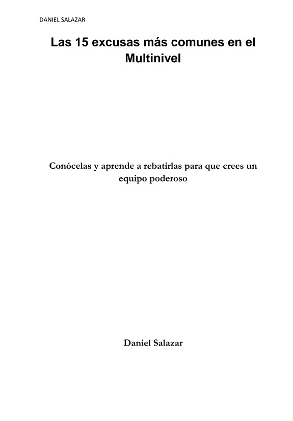 Aprende como llevar tu negocio a otro nivel con este libro que es una poderosa herramienta y un poderoso entrenamiento. Este es un libro que tienes que prestárselo a tu prospecto antes de darle el plan de compensación de tu empresa y es un libro que tienes que leer antes de pararte a dar un plan de compensación en público. La idea de escribir esto me viene después de tanta impotencia al ver que mi red no crecía, en ese momento me puse a investigar para encontrar una solución. Es gracias a esta investigación y análisis que me doy cuenta o descubro que muchas personas no se registran o se registran, pero no duran en el negocio porque nunca entendieron bien de que se trataba, viéndolo de otro punto de vista, a esas personas nunca le explicaron bien de que se trataba el multinivel. Es por ello que decido escribir un material que explique de la mejor forma posible, como dar un plan de compensación para que así las personas puedan entrar a mi red fácilmente. Escribiendo esto, doy con estas 15 excusas y al mismo tiempo dudas, que tienen los prospectos y tienen también los que odian a la industria de las redes de mercadeo; incluso hasta algunos líderes tienen estas dudas, así que por ellos me inspiré en buscarle las mejores respuestas para que tú, que estás aquí y no sabes nada del multinivel, puedas eliminar esas dudas. Tú líder, que estás cansado de encontrarte con gente que sea por inocencia o mala intención, ponen estas excusas o tienen estas dudas, puedas gracias a este libro aclarárselas y así puedan estar en tu equipo. . Te aseguro que después que les des a cada excusa su respuesta, a estas personas no les quedará de otra, más que entrar a tu equipo.