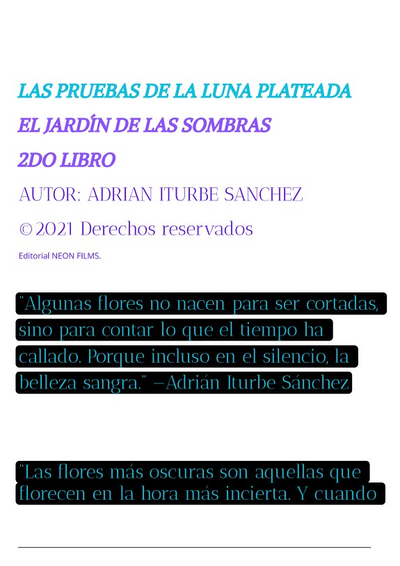 LAS PRUEBAS DE LA LUNA PLATEADA EL JARDÍN DE LAS SOMBRAS 2DO LIBRO AUTOR: ADRIAN ITURBE SANCHEZ ©2021 Derechos reservados “Algunas flores no nacen para ser cortadas, sino para contar lo que el tiempo ha callado. Porque incluso en el silencio, la belleza sangra.” —Adrián Iturbe Sánchez “Las flores más oscuras son aquellas que florecen en la hora más incierta. Y cuando canten, el mundo sabrá que ha llegado el momento de arder o renacer.” — Adrián Iturbe Sánchez