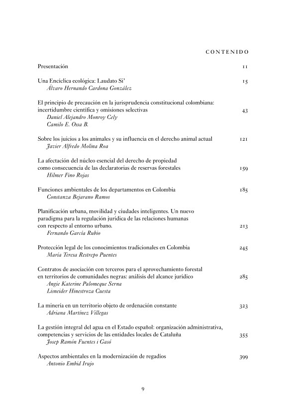 El Derecho del medio ambiente es una rama del derecho en permanente evolución cuyos cambios se ven impulsados por múltiples factores tales como el avance científico, la mayor concientización sobre la relación de pertenencia y dependencia del hombre con la naturaleza, los graves daños ambientales, las fuerzas sociales que exigen avanzar hacia una protección ambiental más efectiva, la certeza sobre los riesgos que genera el uso de ciertos elementos o el desarrollo de algunos proyectos, el afán de mantener la integridad humana y el reconocimiento de la ineludible tarea de seguir avanzando en la protección del entorno natural. Este cambio permanente exige de la academia un análisis no solo de los nuevos contenidos normativos sino, además, de la reacción de los tribunales y de la sociedad ante las nuevas realidades jurídicas, tarea que fue asumida desde 1999 ininterrumpidamente por el Grupo de Investigación en Derecho del Medio Ambiente de la Universidad Externado de Colombia, y que se ve reflejada en la colección «Lecturas sobre Derecho del Medio Ambiente» en la cual se presenta una variedad de artículos resultado de las investigaciones realizadas por los miembros del grupo y por invitados que han querido participar de esta obra colectiva. El tomo XVI de esta colección presenta novedosas perspectivas del estudio jurídico ambiental. La obra se inicia con el artículo del profesor Álvaro Hernando Cardona «Una Encíclica ecológica: Laudato, quien a partir de la descripción del texto religioso analiza la forma como su contenido podría verse reflejado en la normatividad colombiana y en algunos escenarios e instrumentos jurídicos de escala internacional.