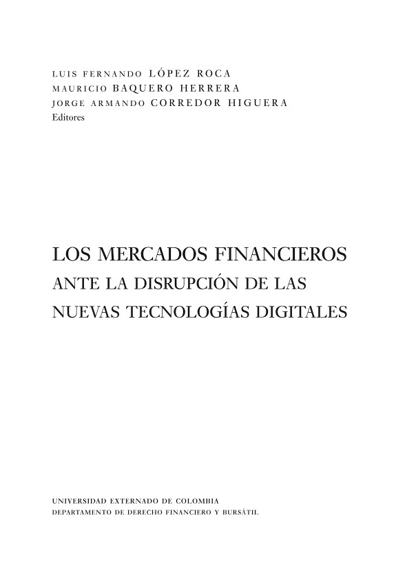 Bajo el nombre de Los mercados financieros ante la disrupción de las nuevas tecnologías digitales, la Universidad Externado de Colombia y el Departamento de Derecho Financiero y Bursátil de la misma casa de estudios presentan ante la comunidad académica una obra sin par en el concierto nacional, que recoge casi una veintena de trabajos que tienen como común denominador ocuparse de diversos tópicos tradicionales de los mercados financieros, mirados ahora a partir del prisma de las nuevas tecnologías digitales. De esta manera el libro que usted, amigo lector, tiene en sus manos, lo paseará desde las interesantes facetas del asesoramiento financiero, ahora desde la visión del llamado robo advice, hasta lo relacionado con la naturaleza jurídica de los criptoactivos y la función de la blockchain en la compensación y liquidación de los mercado de valores, pasando por las características y problemáticas de los denominados «neobancos» y de los eco-sistemas de pago digitales, para solo mencionar algunos de los principales temas tratados. Esta breve descripción del enfoque y de los temas que fueron tratados por los distintos autores a lo largo de la obra muestran su riqueza y su valor doctrina-rio para los distintos interesados en el ecosistema FinTech. El abanico de temas tratados en el presente libro pretende dar al lector un material de con-sulta que le permita comprender de manera reflexiva y profunda las distintas manifestaciones de esta revolución disruptiva en los mercados financieros, para luego aplicar las lecciones en un ámbito académico o profesional.