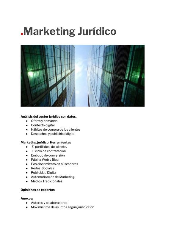 EBOOK: MARKETING JURÍDICO Esta publicación pretende ayudar a los profesionales del derecho a entender y aprovechar los cambios que se están produciendo en el sector jurídico, especialmente los relacionados con la forma de vender y comunicar los servicios y reputación de un despacho. Para este fin, desde Observatorio.Digital hemos contado con la opinión y saber hacer de dos expertos reconocidos en la materia: Alejandro Salgado y Francisco Naranjo, ambos forman parte del equipo de DuoDigito.com, agencia especializada en mejorar la comunicación y ventas de despachos profesionales. Además, a lo largo del texto se irán mostrando opiniones de varios profesionales del sector que han aportado sus experiencias personales durante los últimos años. EBOOK: MARKETING JURÍDICO Marketing jurídico: Sector y mercados objetivos ● Oferta y demanda ● Contexto digital ● Hábitos de compra de los clientes ● Despachos y publicidad digital Marketing jurídico: Herramientas ● El perfil ideal del cliente. ● El ciclo de contratación ● Embudo de conversión ● Página Web y Blog ● Posicionamiento en buscadores ● Redes Sociales ● Publicidad Digital ● Automatización de Marketing ● Medios Tradicionales Opiniones de expertos Anexos: ● Autores y colaboradores ● Movimientos de asuntos según jurisdicción