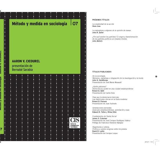 Método y medida en sociología de Aaron V. Cicourel es una revisión crítica de los fundamentos de la metodología cuantitativa en la investigación sociológica. Esta obra examina en profundidad el problema de la validez de las prácticas analíticas más usuales en sociología y de los supuestos epistemológicos y metodológicos en los que dichas prácticas se basan. Para Cicourel, la interacción entre teoría, método y datos puede resultar problemática, especialmente en lo que se refiere a las propiedades numéricas que la metodología cuantitativa imputa a los procesos sociales. No es sufi ciente utilizar para la investigación sociológica los instrumentos reconocidos y validados, sino que los datos obtenidos a través de ellos deben ser estudiados teniendo en cuenta el contexto etnográfico e interpersonal del que proceden. Transitando por diferentes ciencias sociales, este texto clásico plantea un análisis, siempre necesario, de los fundamentos teóricos que dan forma a las premisas y a la lógica de la investigación social.