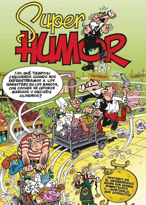 Nuevo número de la colección «Súper Humor» de Mortadelo y Filemón. ¡Las últimas novedades de Mortadelo y Filemón recogidas en un solo libro! Este álbum contiene la aventura de ¡Misterio en el hipermercado! y una recopilación de material variado de Ibáñez. En ¡Misterio en el hipermercado!, Mortadelo y Filemón han de viajar al pueblo de Valdetrasto para mediar en una pelea entre el alcalde y el dueño del hiper de la ciudad, que está causando serios problemas de convivencia. Misión por España, aventura en la cual los dos agentes de la T.I.A. han de cumplir una misión que les llevará a recorrer las principales ciudades de España. Seguidamente el lector podrá disfrutar de una recopilación de Rompetechos, con aventuras no publicadas anteriormente en la colección Súper humor, para acabar con páginas de la primera época de Mortadelo y Filemón. ____________________________________________________ Sobre la colección: La colección «Súper Humor» empezó a publicarse en la editorial Bruguera en el año 1975. Sus números recopilaban aventuras aparecidas anteriormente en la colección «Olé!», mezclando diversos personajes de la casa en un mismo álbum, aunque siempre priorizando los de Ibáñez y Escobar. Posteriormente, en 1987, Ediciones B recuperó la colección manteniendo su formato original hasta 1992, momento en el que se empezó a hacer distinción por personajes, pudiendo encontrar «Súper Humor» seriados de Mortadelo y Filemón, Superlópez, Zipi y Zape, etc. En la actualidad se publica un único número de «Súper Humor» al año con las últimas novedades de las series de Mortadelo y Filemón y Superlópez.
