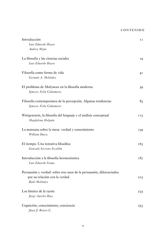 En Motivos filosóficos se invita al lector a hacer un recorrido por los problemas fundamentales de la filosofía. Aunque el libro está orientado en una dirección que va desde asuntos propiamente teóricos (la percepción, el conocimiento, el lenguaje, el tiempo, la verdad, la interpretación, la religión) hasta asuntos relacionados con la filosofía práctica (ética y política), la línea del recorrido no es, ni puede ser, recta. Se ha querido ante todo dar una muestra de la diversidad de las preocupaciones filosóficas más importantes y también del ambiente plural y multifacético de la investigación filosófica en nuestro medio y en nuestra época. Lo que se espera como resultado es que en cada una de las estaciones de ese recorrido no lineal el lector se haga preguntas, se inquiete, y adquiera el apetito que lo llevaría a acercarse a cada uno de los asuntos aquí tratados para nutrirse de las propias fuentes. Se trata, por esto, de una colección de motivos de la filosofía que han de servir, justamente, para mover al lector y al investigador en ciencias sociales a que dialogue y esclarezca sus propias preocupaciones teniendo en cuenta los esfuerzos esclarecedores emprendidos por la filosofía desde sus múltiples esquinas.