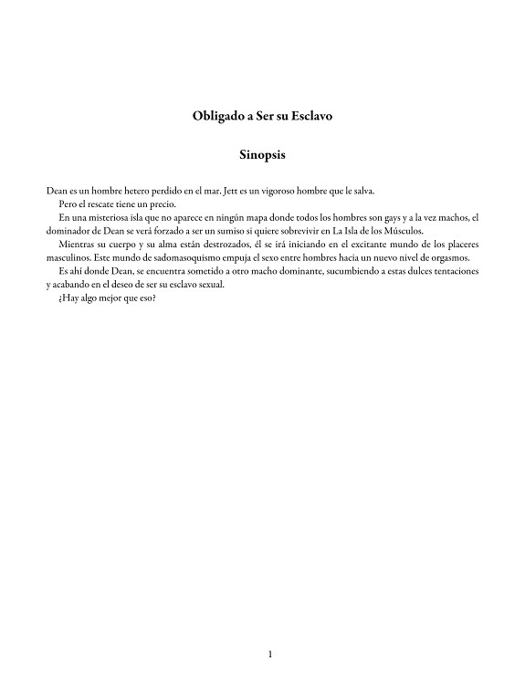 Dean es un hombre hetero perdido en el mar. Jett es un vigoroso hombre que le salva. Pero el rescate tiene un precio. En una misteriosa isla que no aparece en ningún mapa donde todos los hombres son gays y a la vez machos, el dominador de Dean se verá forzado a ser un sumiso si quiere sobrevivir en La Isla de los Músculos. Mientras su cuerpo y su alma están destrozados, él se irá iniciando en el excitante mundo de los placeres masculinos. Este mundo de sadomasoquismo empuja el sexo entre hombres hacia un nuevo nivel de orgasmos. Es ahí donde Dean, se encuentra sometido a otro macho dominante, sucumbiendo a estas dulces tentaciones y acabando en el deseo de ser su esclavo sexual. ¿Hay algo mejor que eso? Advertencia: Este libro contiene contenido homoerótico y está dirigido a lectores mayores de 18 años. Se recomienda la discreción del lector. 8000 palabras